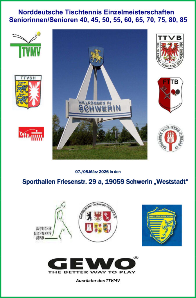 Am kommenden Wochenende finden vom 7. – 8. März 2026 die NORDDEUTSCHEN SENIOREN TISCHTENNIS-MEISTERSCHAFTEN in der Landeshauptstadt von Mecklenburg-Vorpommern – in Schwerin – statt.